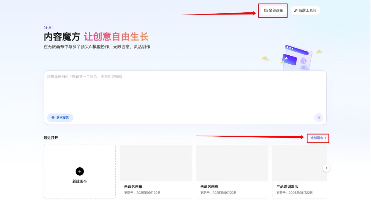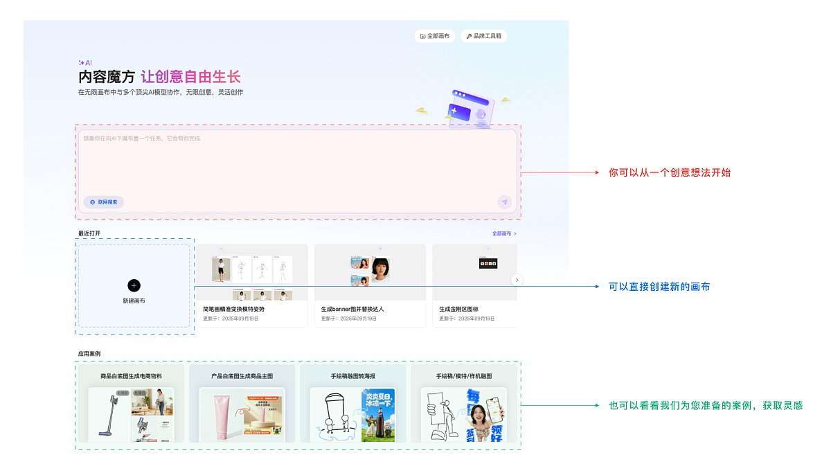 方式二:你可以直接点击新建画布(蓝框),进入画布,进行探索创作。