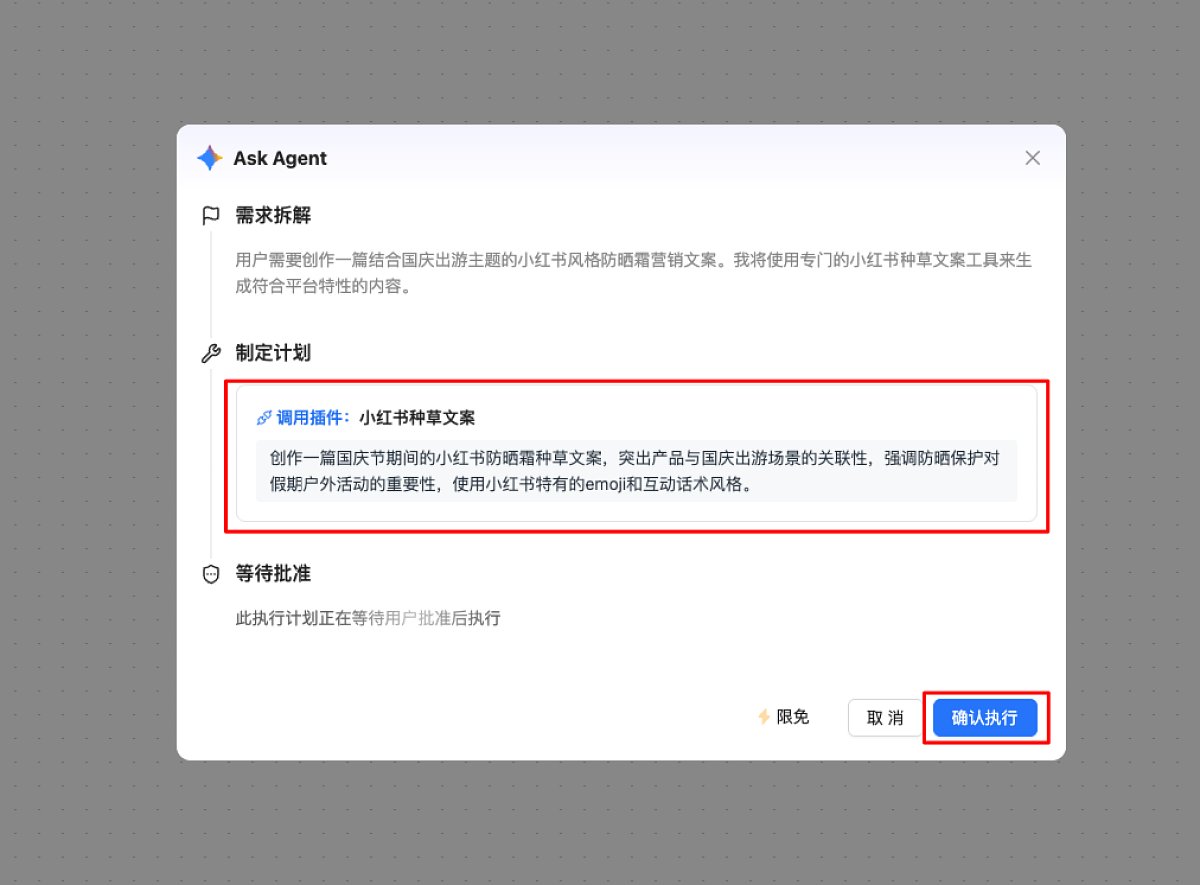 在Agent模式下,发送你的创作需求后,AI进行分析后,会将你的需求进行拆解,然后向你确认需要调用的能力,点击确认执行,即可开始创作内容。
