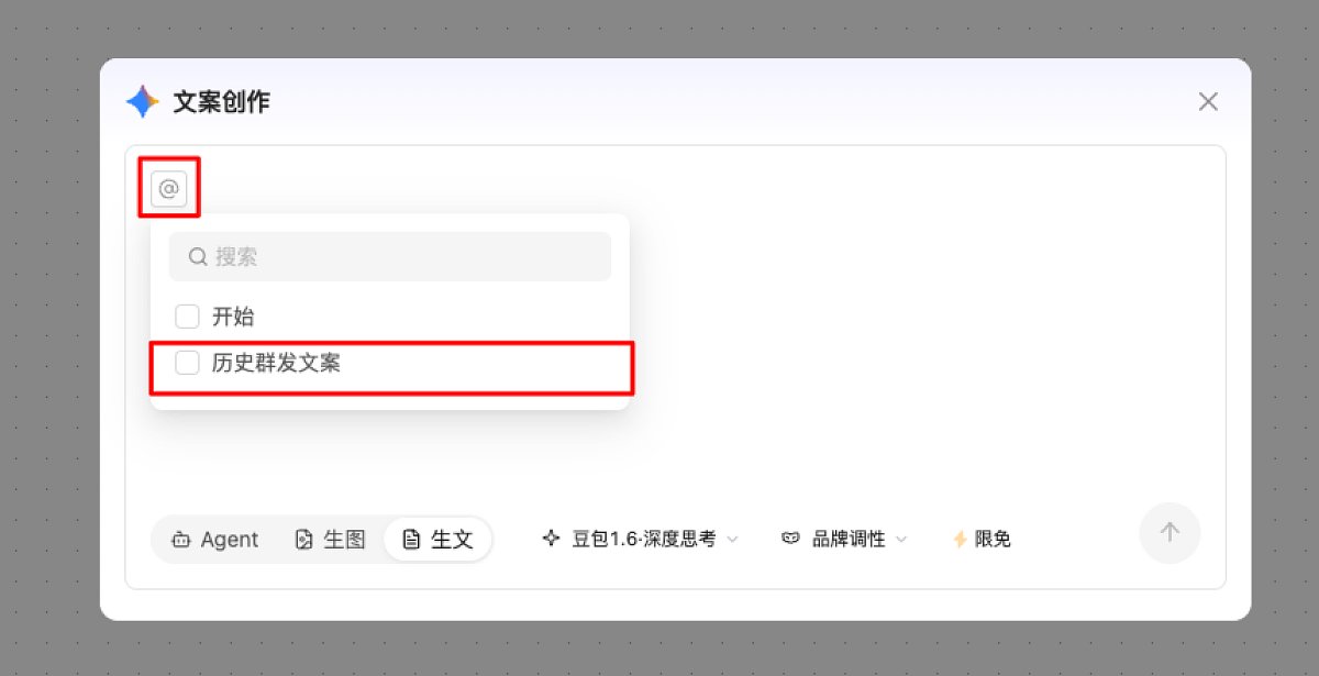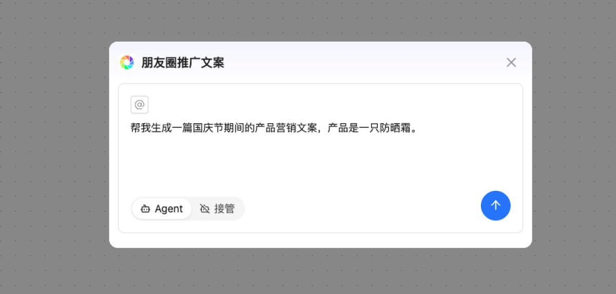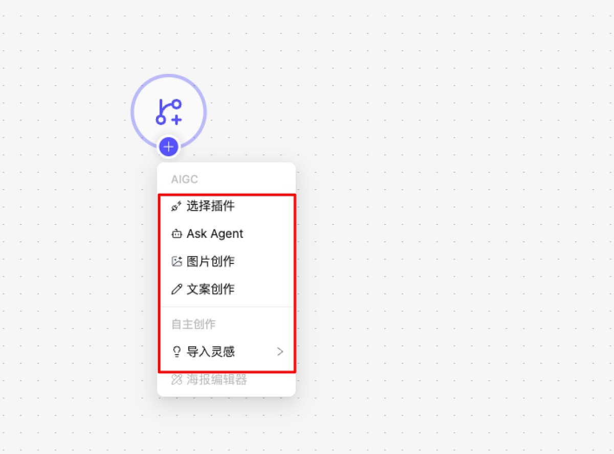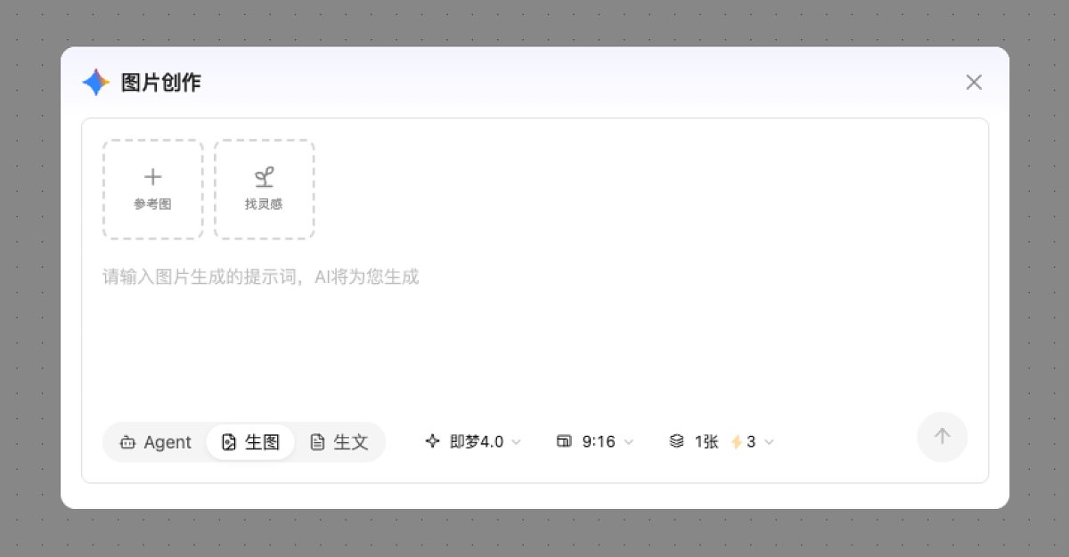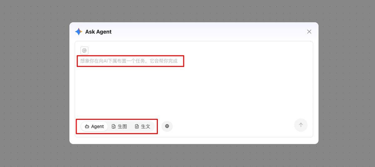 点击加号,选择Ask Agent。输入你的创作需求。默认是Agent模式,AI会自动帮你分析,你的创作内容类型。若你比较明确自己的创作内容类型,也可以直接选择生图或是生文。