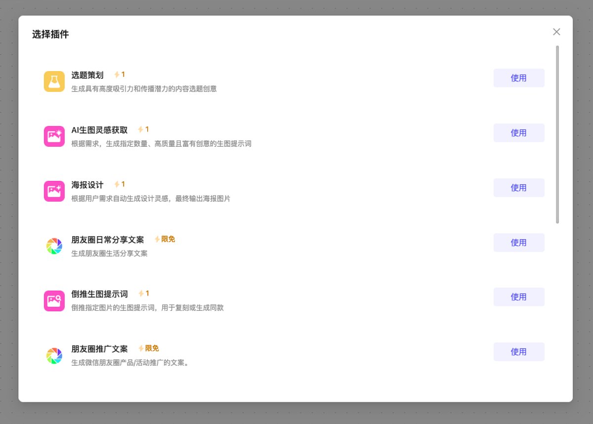 点击“选择插件”后,会有一些系统提供的创作场景插件供你选择,可以为你的想法策划选题,可以帮你生成生图提示词,可以帮你生成朋友圈日常分享文案等等。