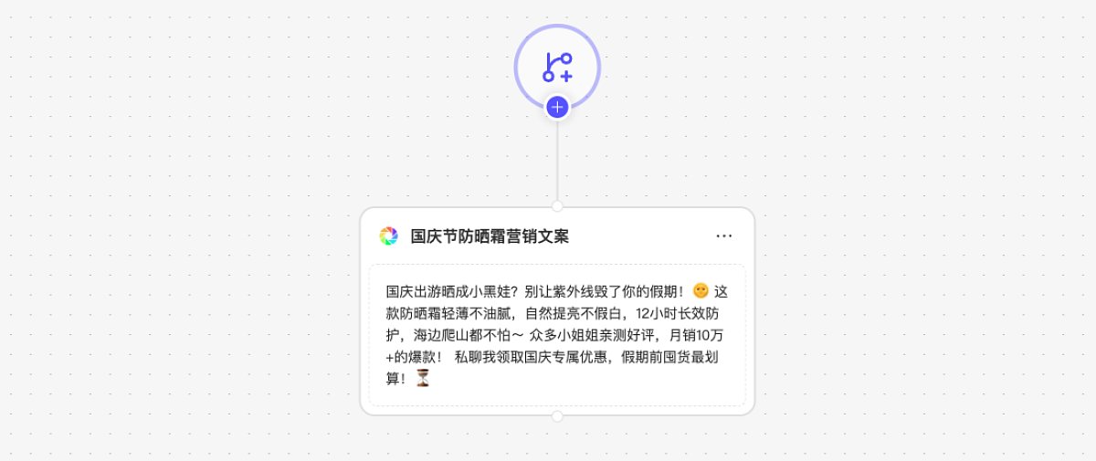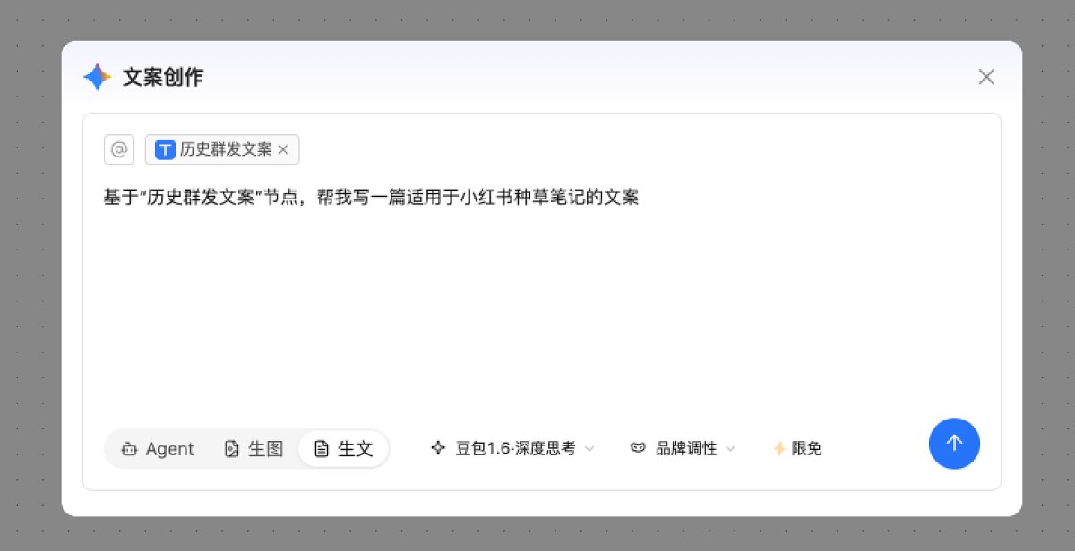 - 选择上下文(选填):当画布中已经有其他的文案节点时,你可以点击选择上下文。上下文可作为文案风格的参考,也可以作为内容的参考(例如基于一段文案,帮我写一篇适用于其他平台的文案)