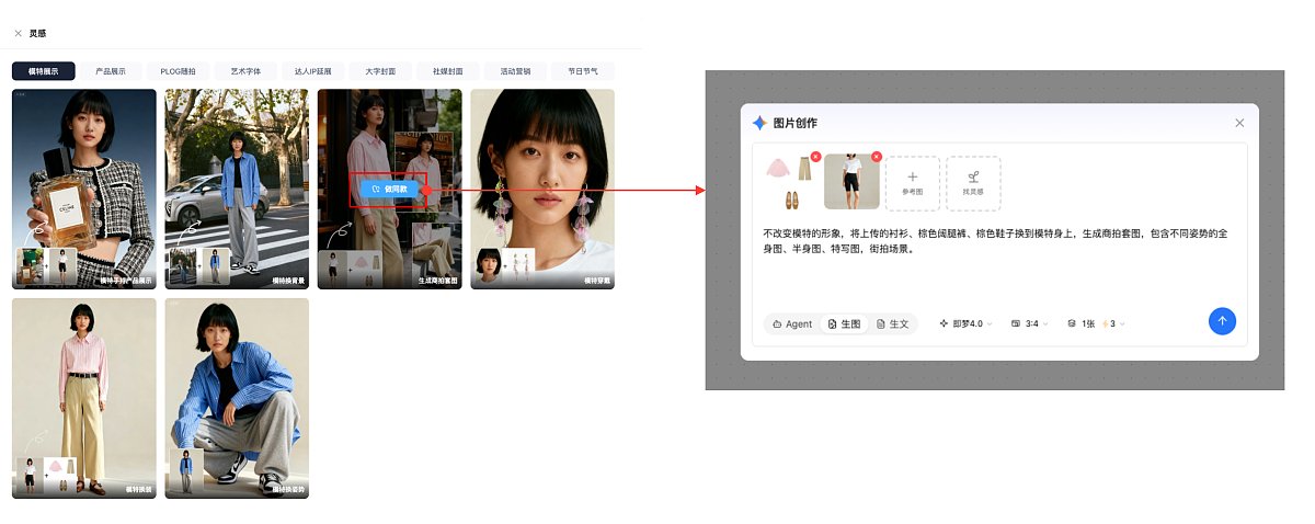鼠标移动到某个灵感上,你就可以点击做同款,一键应用该灵感的参考图、提示词、生图配置等。然后你可以根据你的需求,替换参考图和提示词,或修改生图配置。