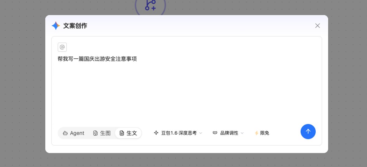 - 输入指令:点击“文案创作”,在弹窗中输入的文案创作需求,点击发送即可开始创作。
