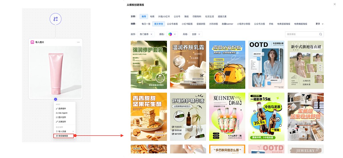 - 选择插件:系统提供了一些创作的插件,让你可以从场景出发,选择自己想要创作的内容,不同场景的插件有着自己独特的创作风格。例如创作小红书种草笔记,选择该插件之后,所创作出来的内容具有小红书比较鲜明的文案风格特色,例如emoji表情、吸引人的开头/标题、分享/种草型的文本风格等。