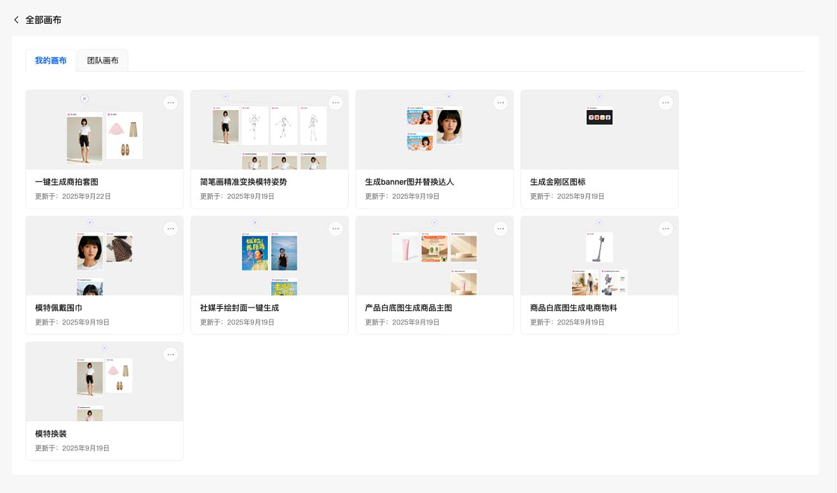 在功能主页,如下图所示,点击全部画布,即可查看我的所有画布,和我的团队其他成员创建的画布。