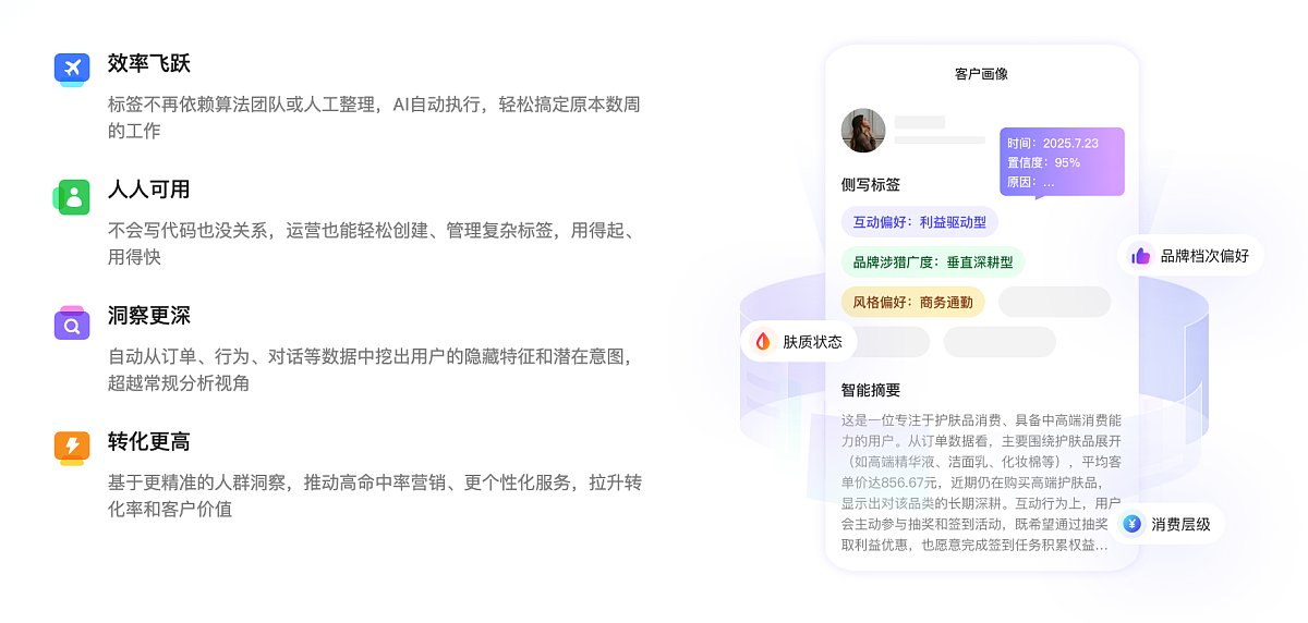 人像侧写使用大模型驱动,智能挖掘用户深层特征,比手动打标更高效,比自动化标签更智能。
