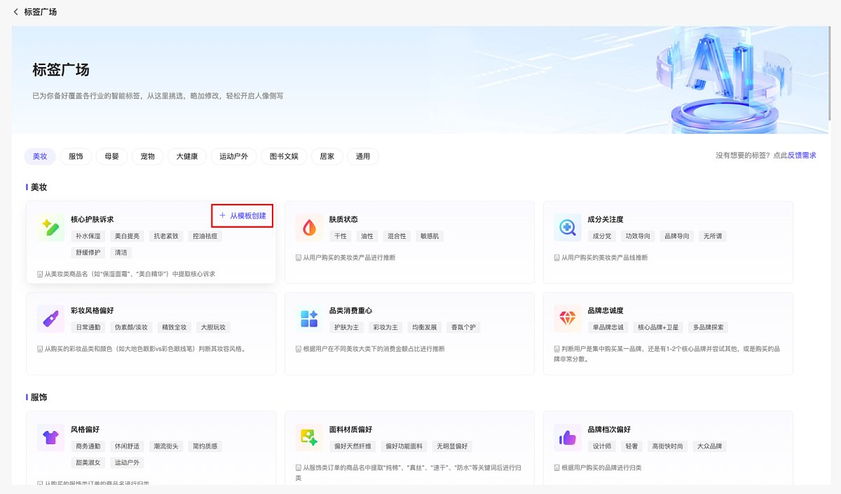从标签广场中选择自己想要的标签,鼠标移上去,点击“从模板创建”。