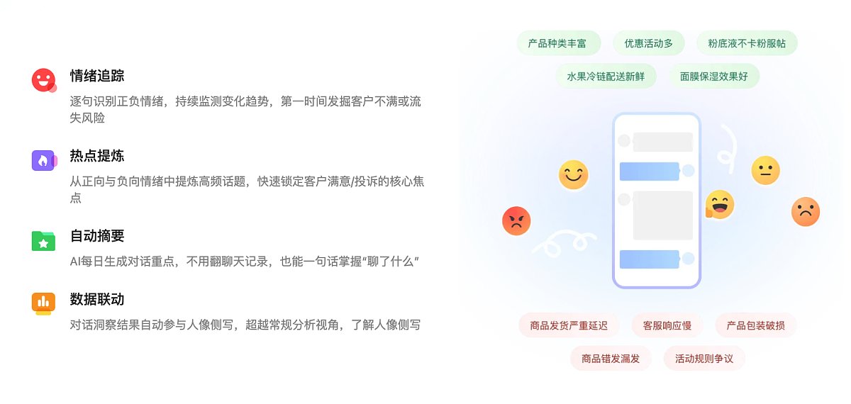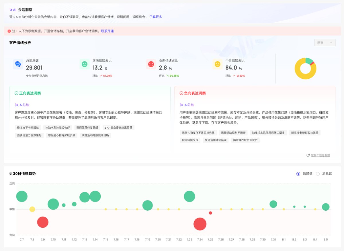 会话洞察通过AI自动分析企业微信会话内容,让你不读聊天,也能快速看懂客户情绪、识别问题,洞察机会。