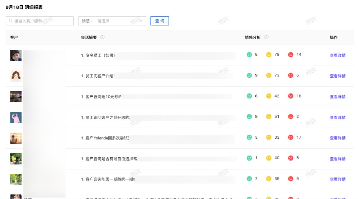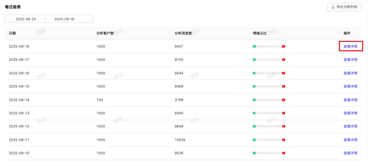 再次点击查看详情,即可查看指定客户的会话摘要、情绪分析结果和当天与员工的聊天记录。